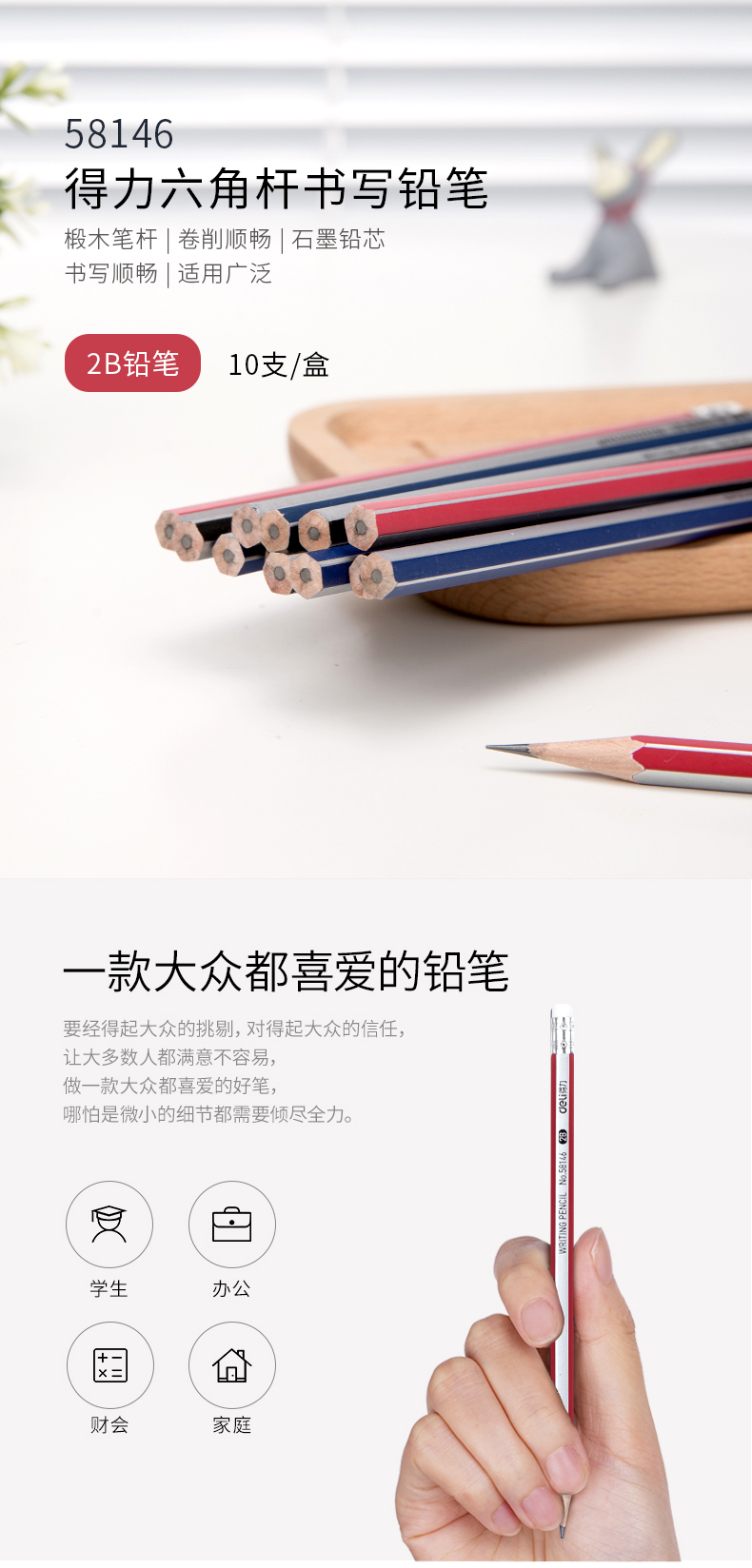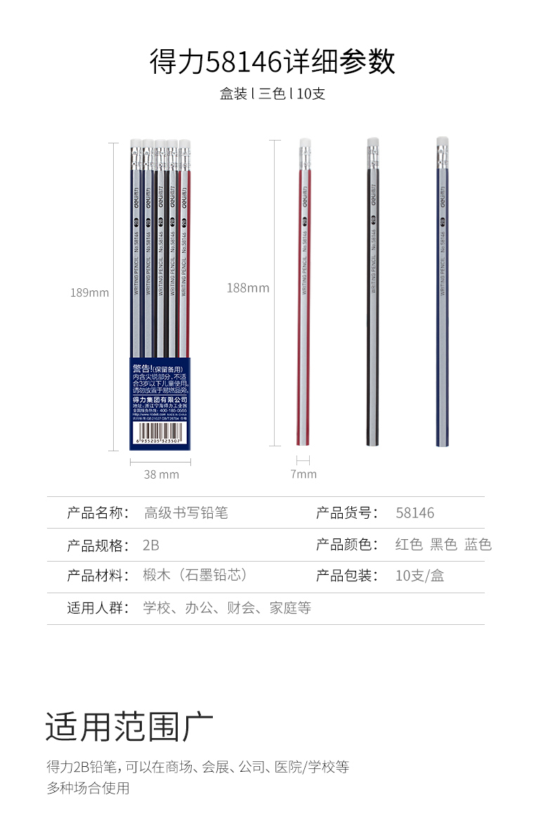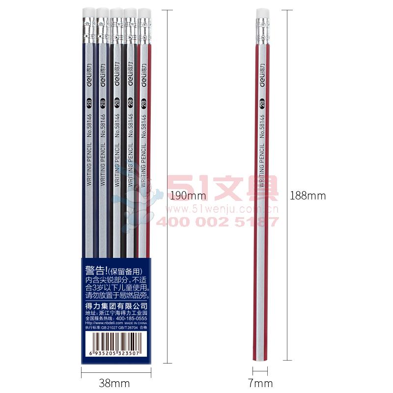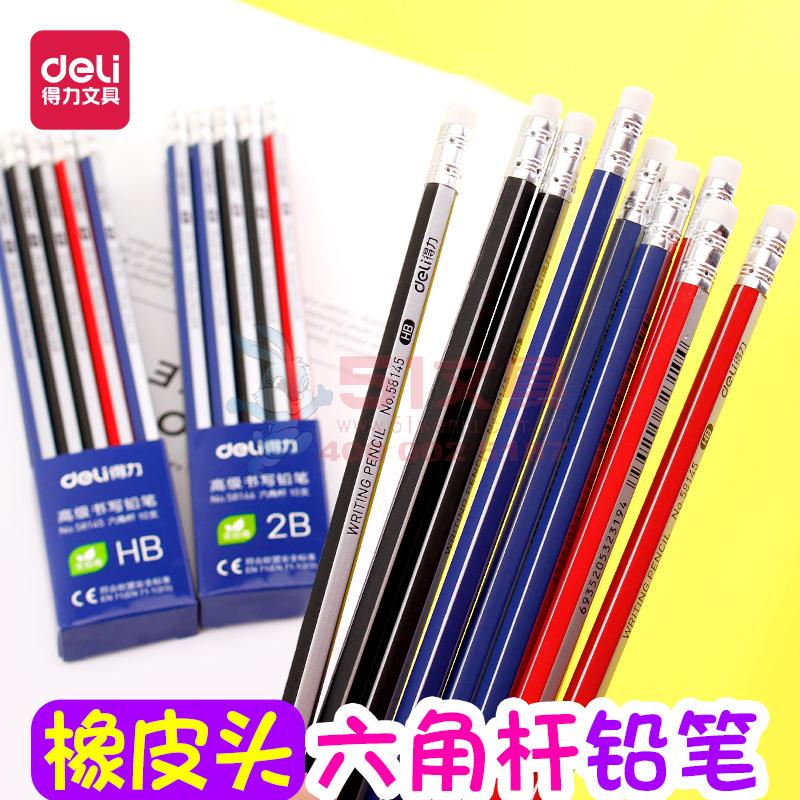 得力58146,2B铅笔带橡皮头六角杆铅笔小学生写字笔