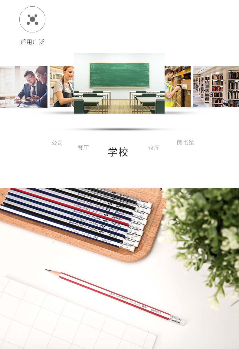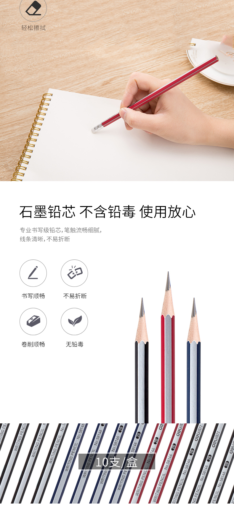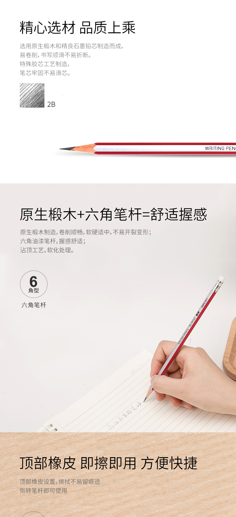 得力58146,2B铅笔带橡皮头六角杆铅笔小学生写字笔